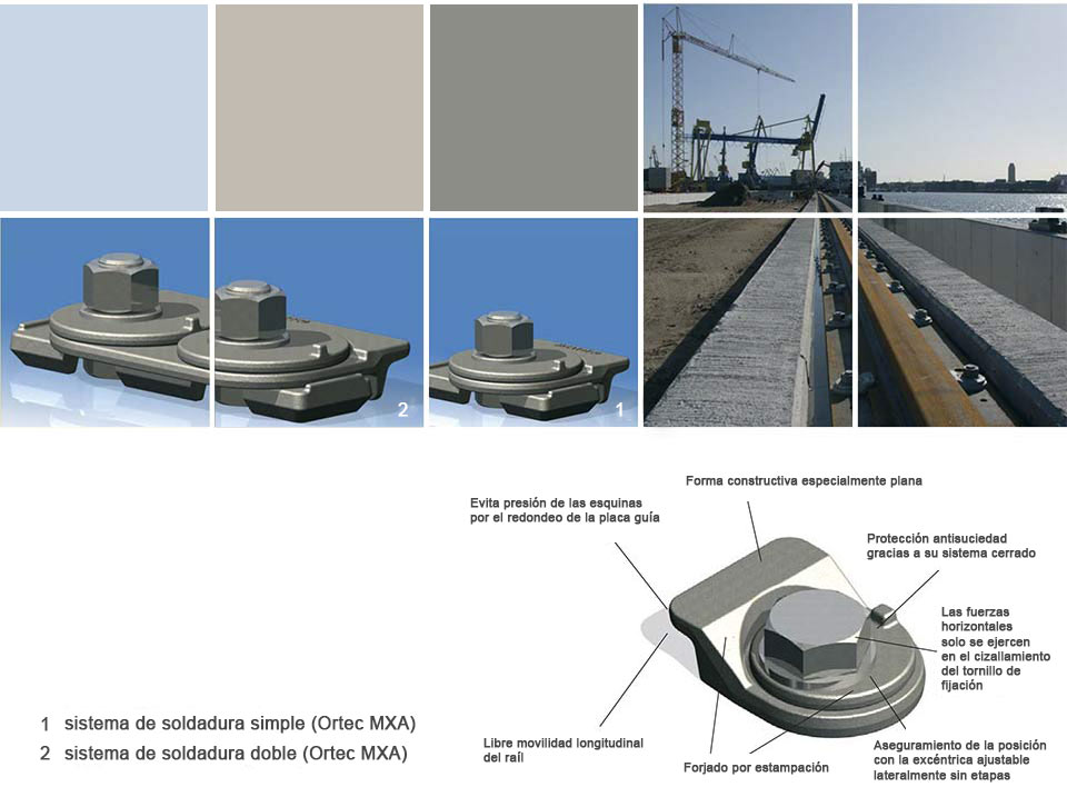Fijaciones especiales para el sistema de vías para grúas: Este es el sistema de fijación soldable Ortec MXA. Este sistema está equipado con una placa guía que soporta el raíl lateralmente sin fijarlo. Esto evita que el deslizamiento del raíl que se produce por las oscilaciones de temperatura y el transporte de cargas afecte a los componentes de fijación o los dañe.
